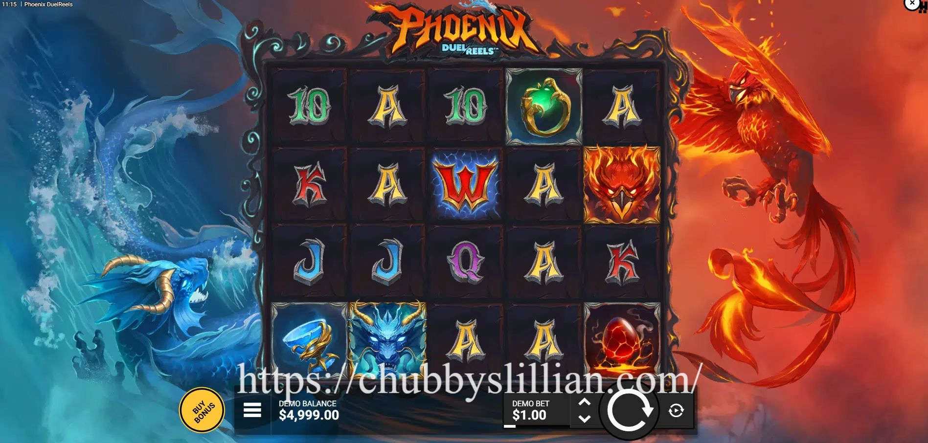 Phoenix DuelReels menampilkan latar langit merah menyala, sayap Phoenix yang berkobar, dan simbol api magis. Simbol-simbol yang hadir antara lain: